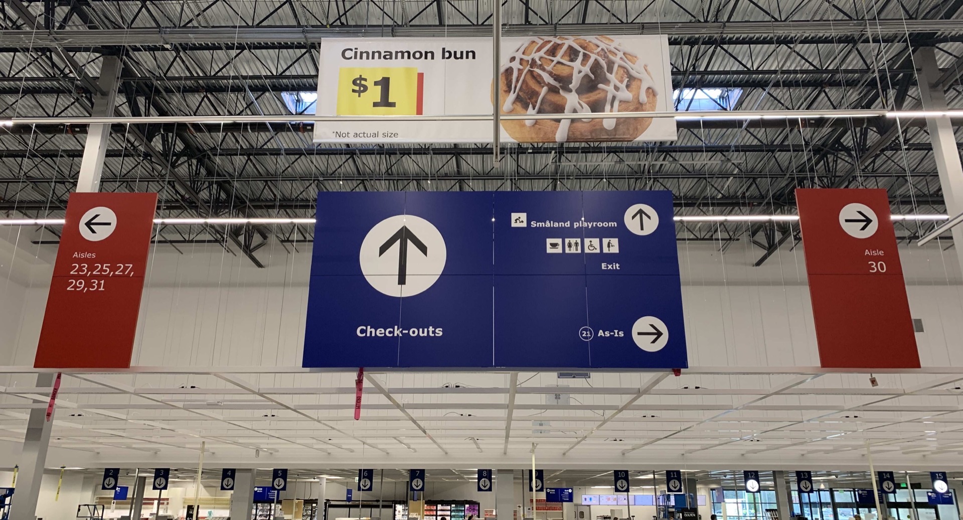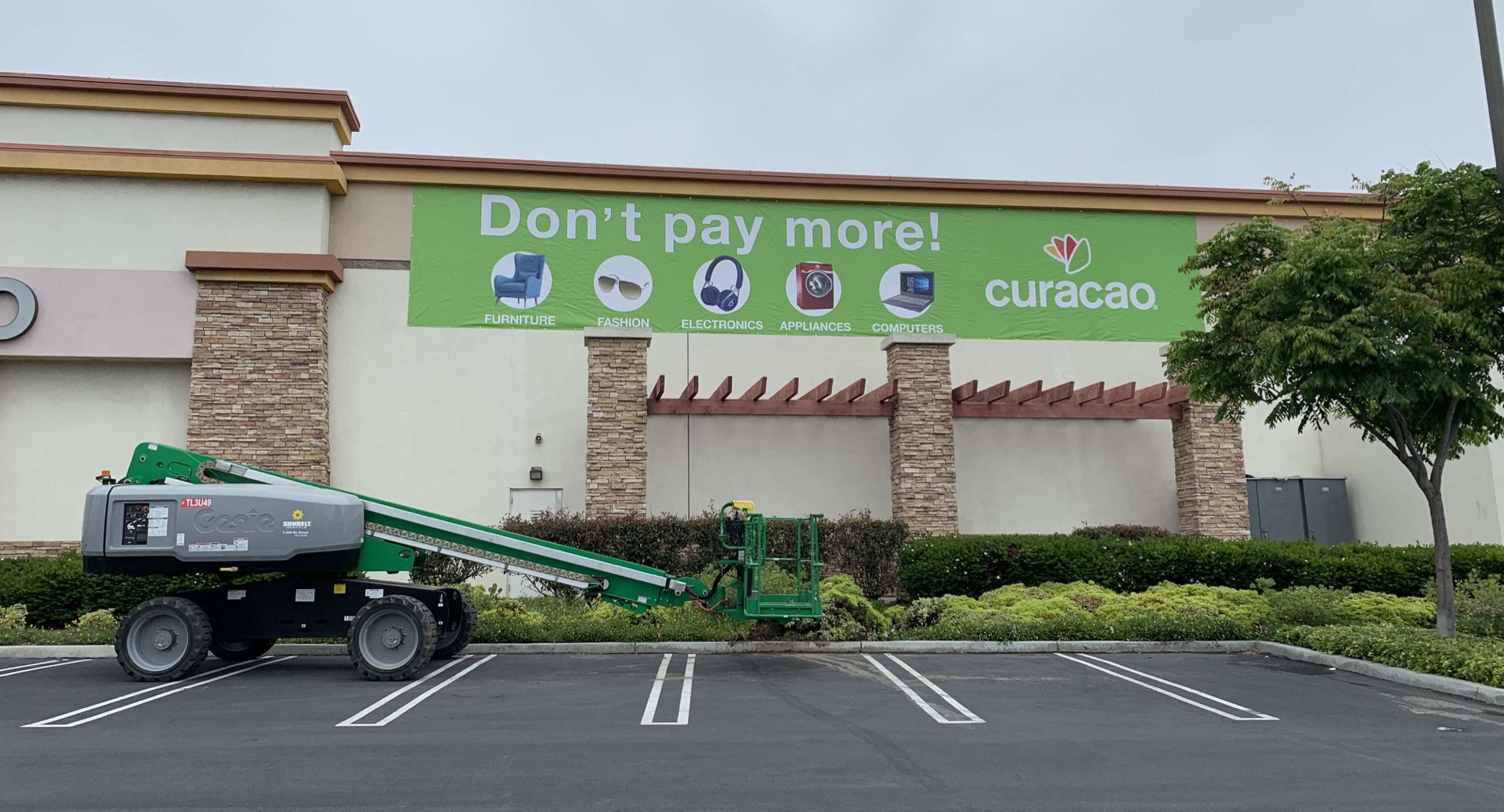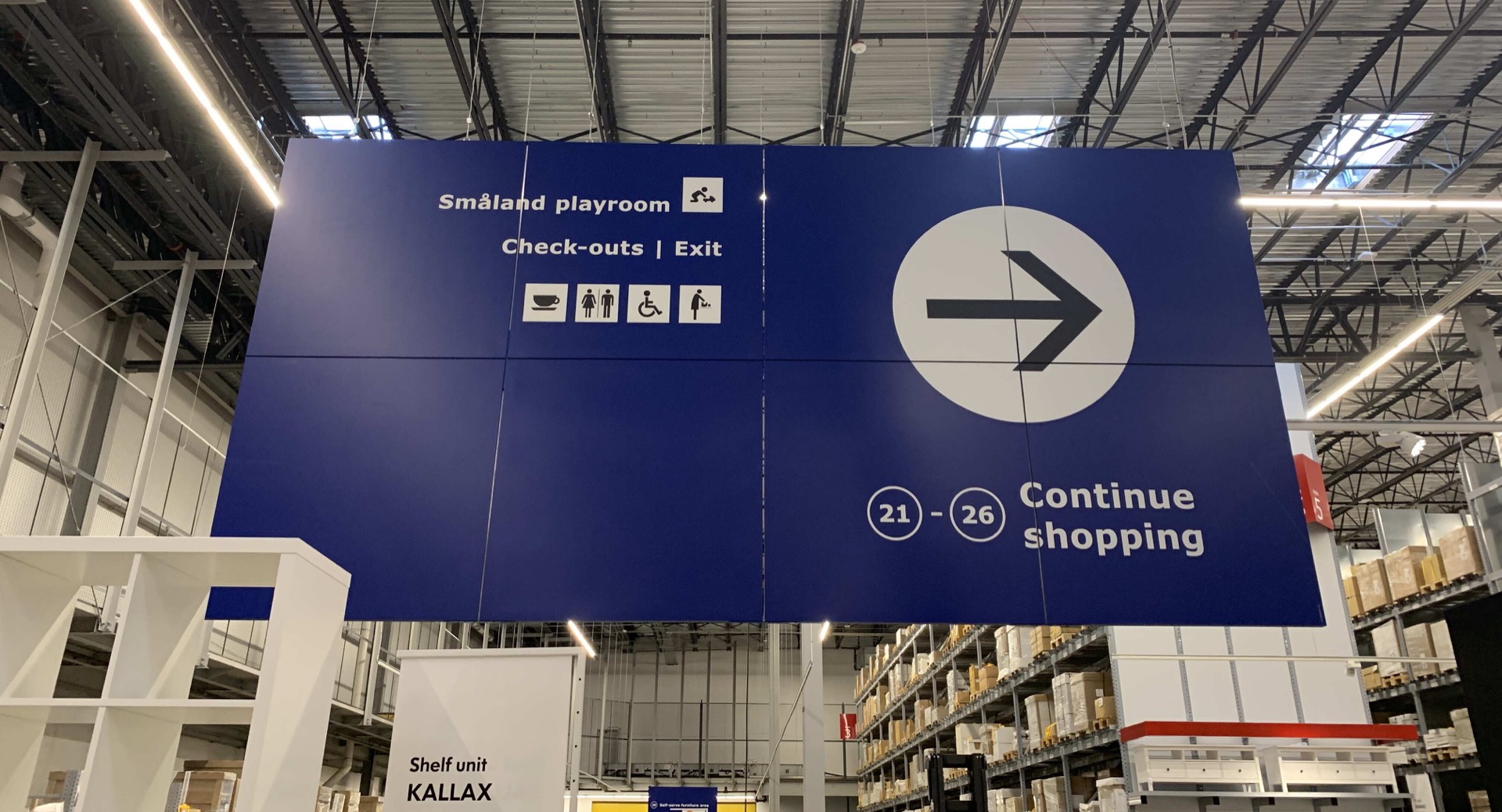 We've produced and installed overhead wayfinding systems for IKEA stores, storefront banners for Curacao retail locations, and ceiling-mounted directional signage for high-traffic commercial spaces. Every sign is fabricated to spec — dimensional lettering, illuminated light boxes, or flat panel graphics — with materials rated for indoor longevity or outdoor weather resistance depending on placement.
